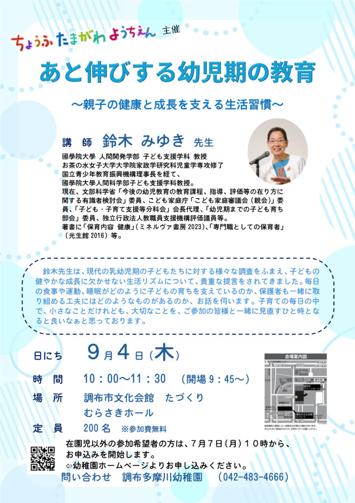 調布多摩川幼稚園では、年に数回、保護者や、子育てをするみなさんの学びの場として、講演会を企画しています。