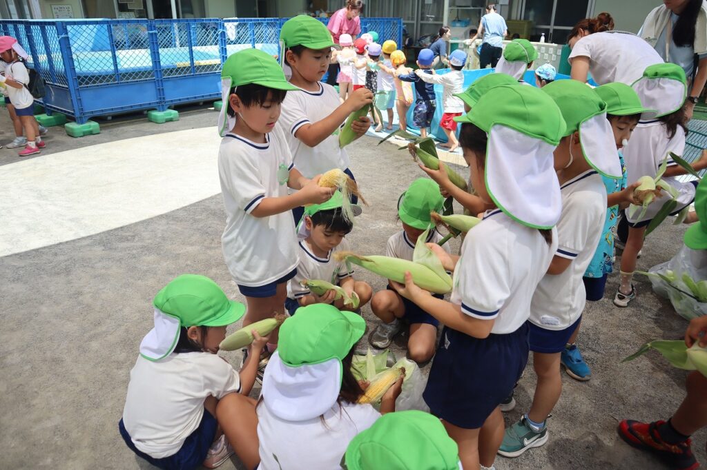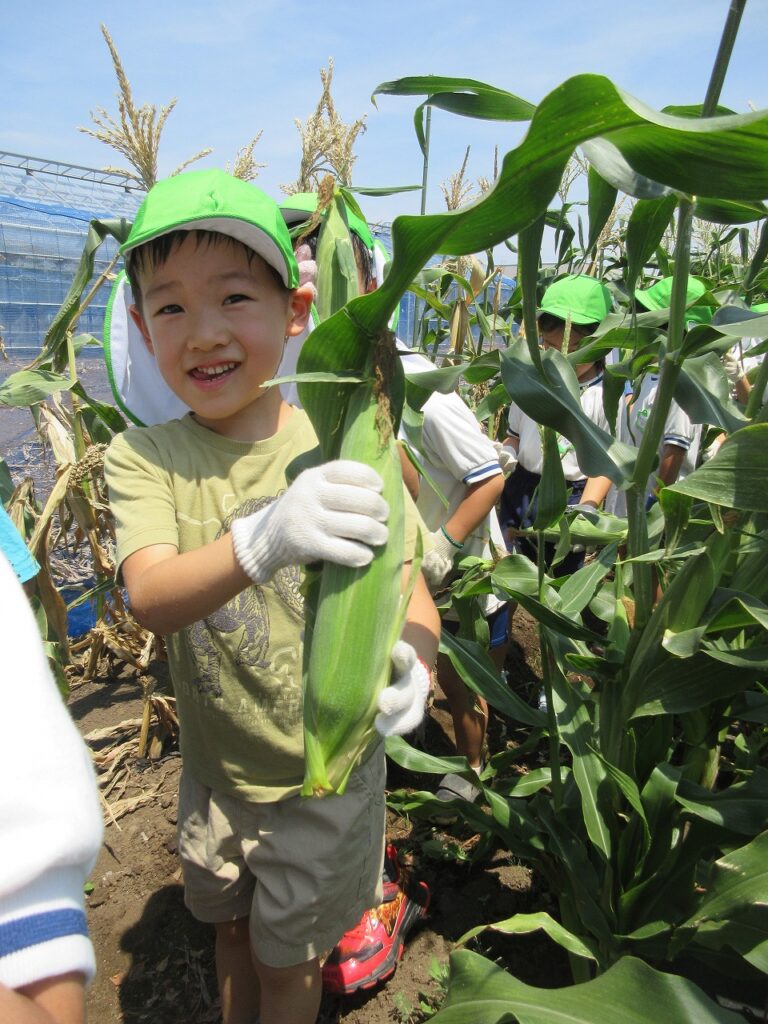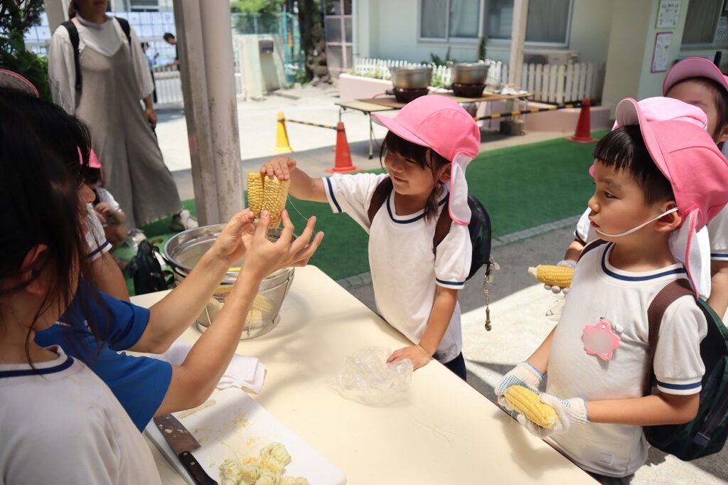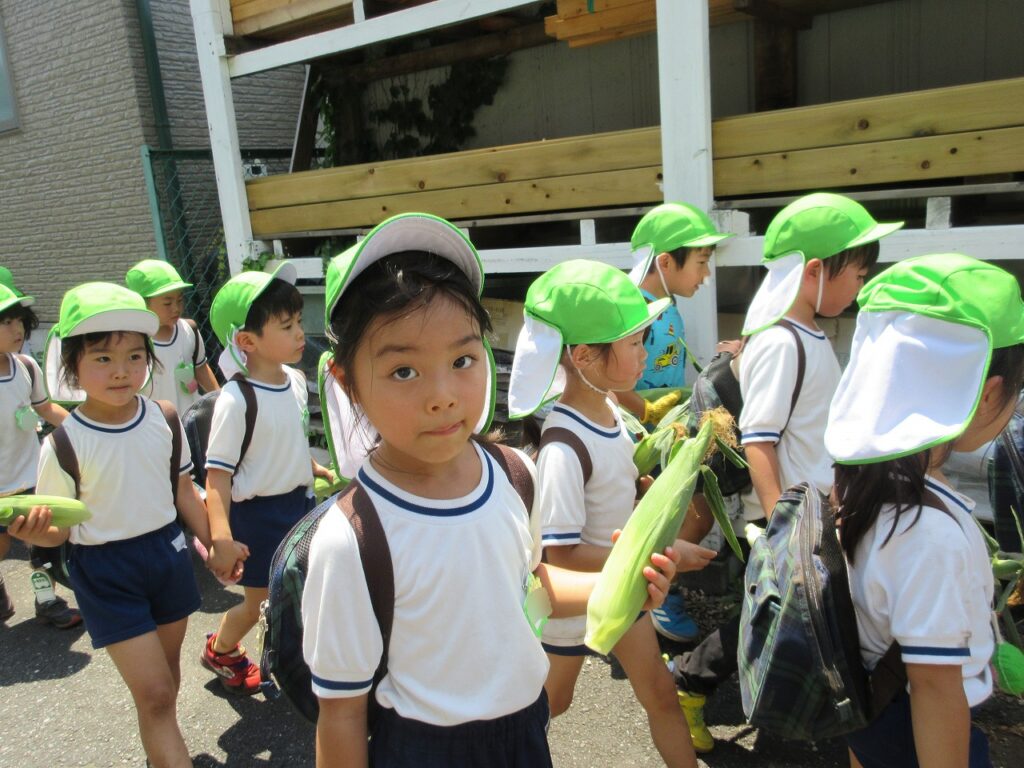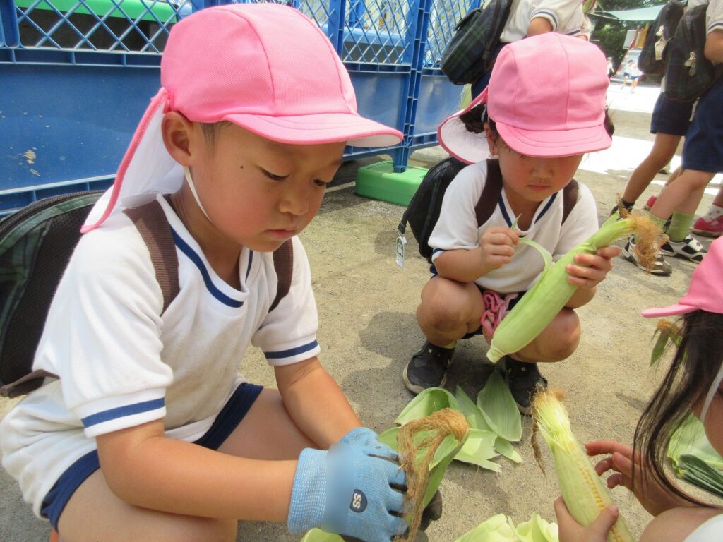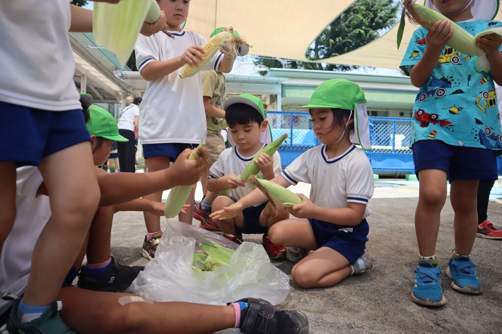 年長の子どもたちが、4月に種をまいたとうもろこしが、収穫の時期をむかえました。