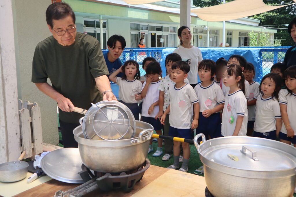帰ってくると、幼稚園では園長先生が大鍋にお湯を沸かして待っていました。