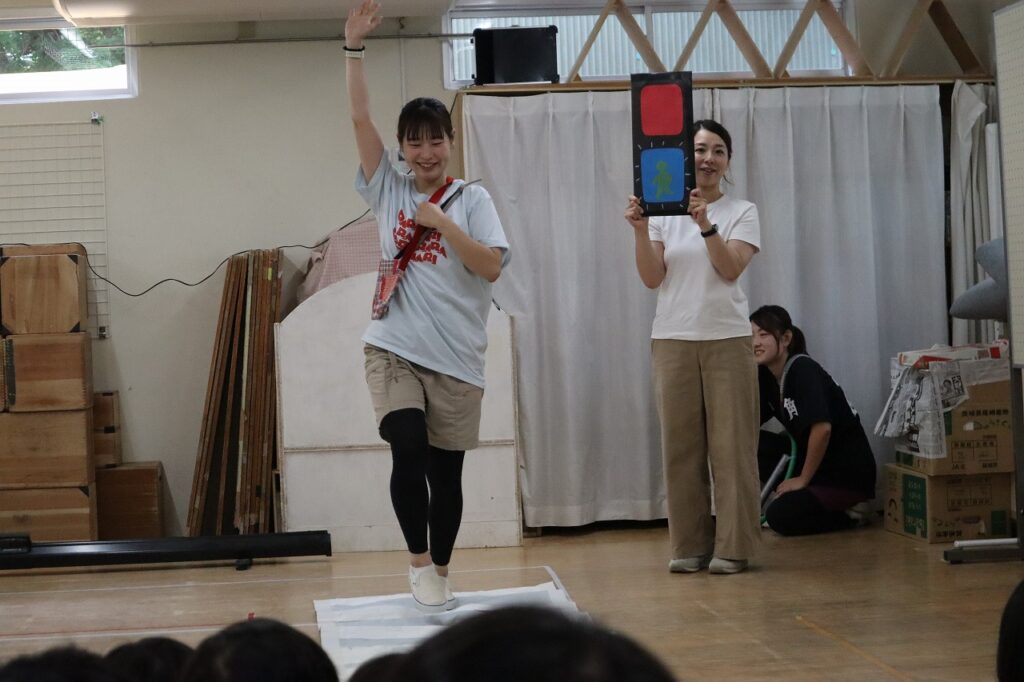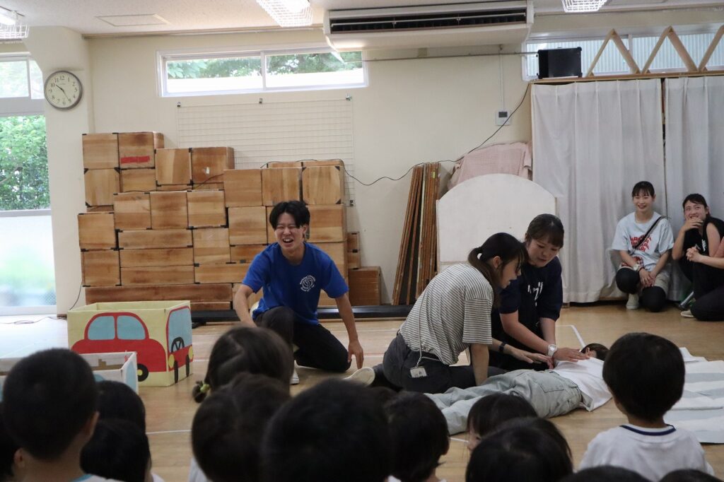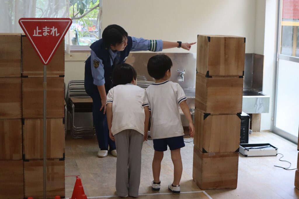 調布多摩川幼稚園では、交通安全指導の際に、先生たちが交通安全の劇を見せています。